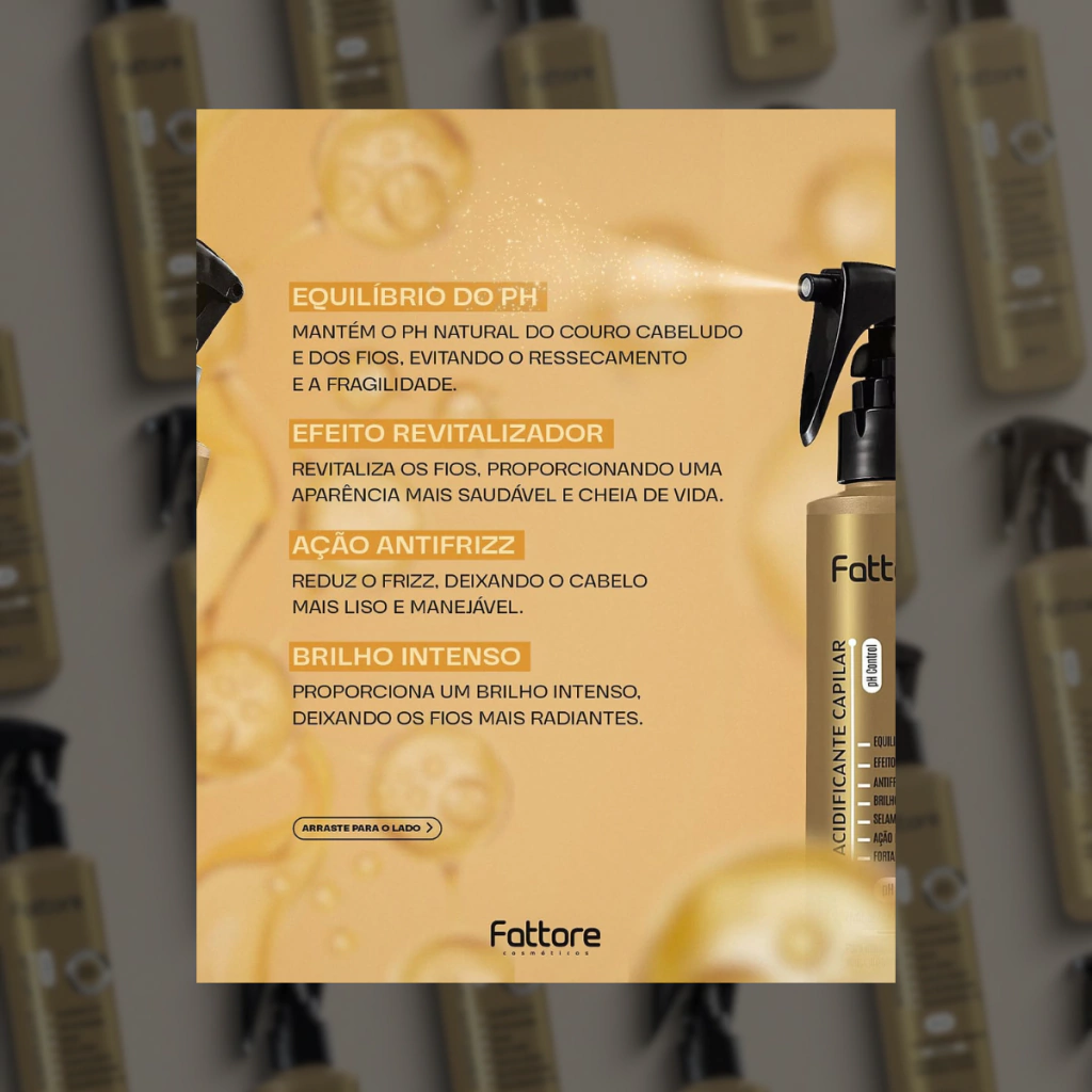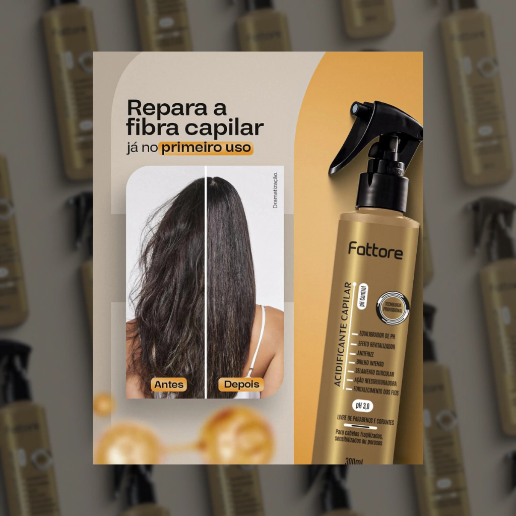 Transforme sua rotina de cuidados e sinta a diferença de cabelos fortes, hidratados e cheios de brilho todos os dias com o Fattore Acidificante Capilar. Seu cabelo merece esse cuidado especial!