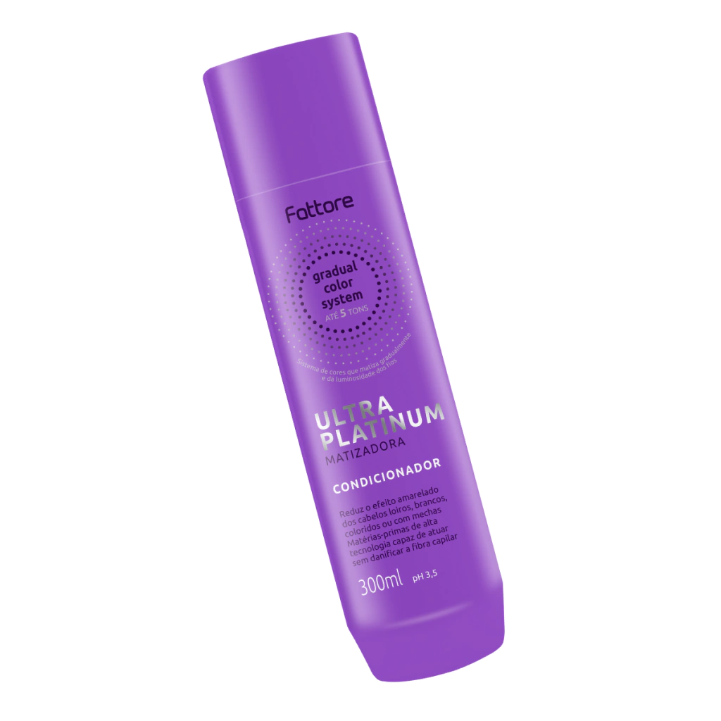 O Condicionador Fattore Ultra Platinum Matizadora foi especialmente desenvolvido para reduzir o efeito amarelado em cabelos loiros, brancos e coloridos. Sua fórmula avançada neutraliza os tons indesejados, proporcionando uma cor mais vibrante e uniforme. Além de matizar, o condicionador hidrata e desembaraça os fios, deixando-os macios, brilhosos e com um aspecto saudável. Ideal para quem busca manter o brilho e a luminosidade dos cabelos.