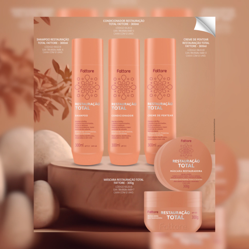 A Máscara de Tratamento Fattore Restauração Total foi desenvolvida para proporcionar uma restauração profunda aos cabelos danificados. Sua fórmula contém Proteínas, Tutano e Ceramidas, que trabalham em conjunto para hidratar, nutrir e fortalecer os fios. As Proteínas ajudam a reconstruir a estrutura capilar, o Tutano oferece uma hidratação intensa e as Ceramidas formam uma barreira protetora, mantendo a umidade e o brilho dos cabelos. Ideal para quem busca cabelos mais fortes, saudáveis e revitalizados.
