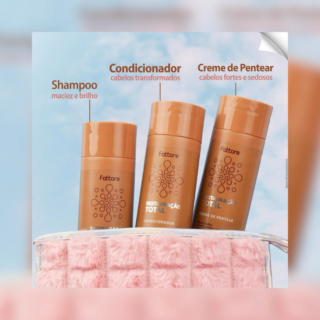 O Condicionador Fattore Restauração Total foi desenvolvido para proporcionar uma restauração profunda aos cabelos danificados. Sua fórmula contém Proteínas, Tutano e Ceramidas, que trabalham em conjunto para hidratar, nutrir e fortalecer os fios. As Proteínas ajudam a reconstruir a estrutura capilar, o Tutano oferece uma hidratação intensa e as Ceramidas formam uma barreira protetora, mantendo a umidade e o brilho dos cabelos. Ideal para quem busca cabelos mais fortes, saudáveis e revitalizados.
