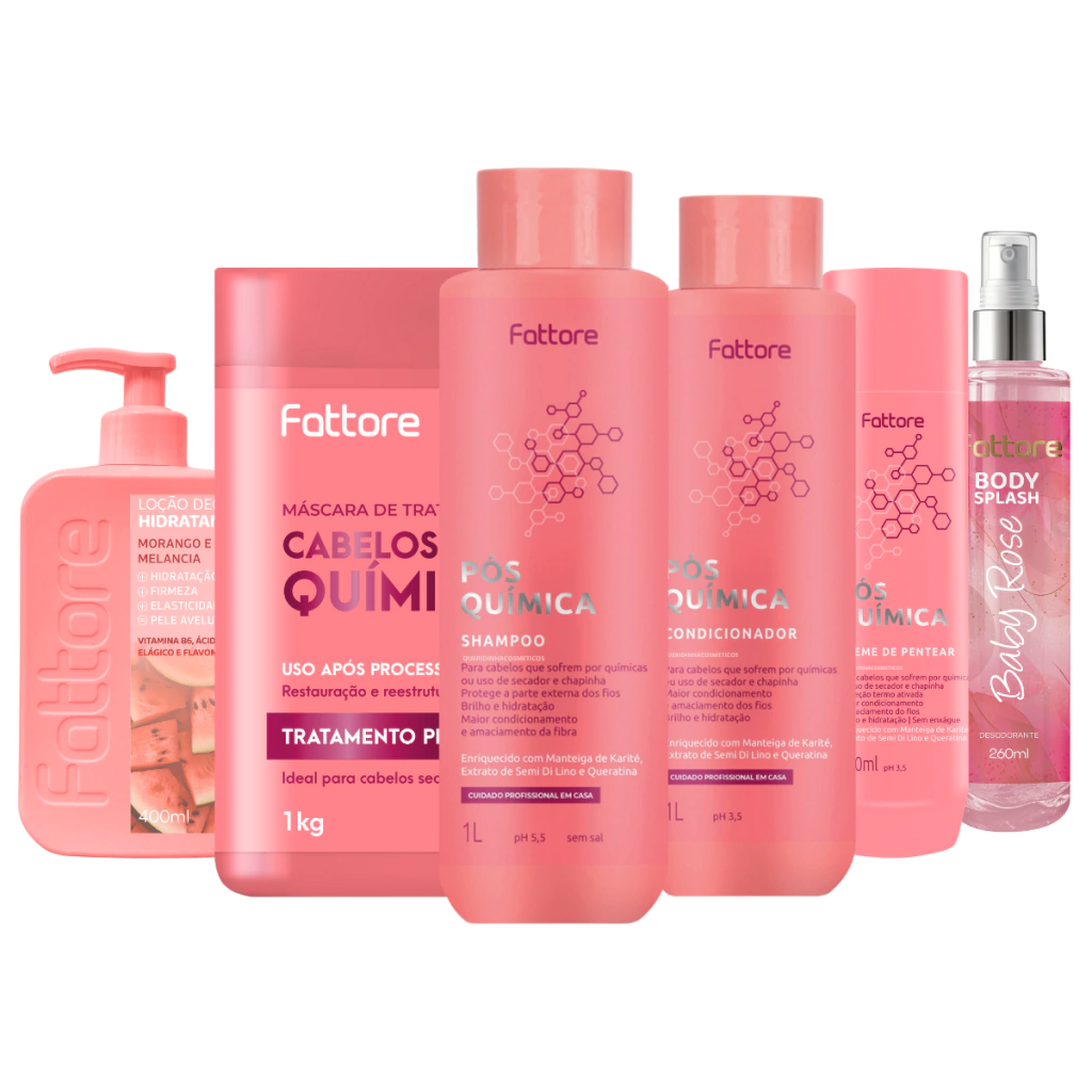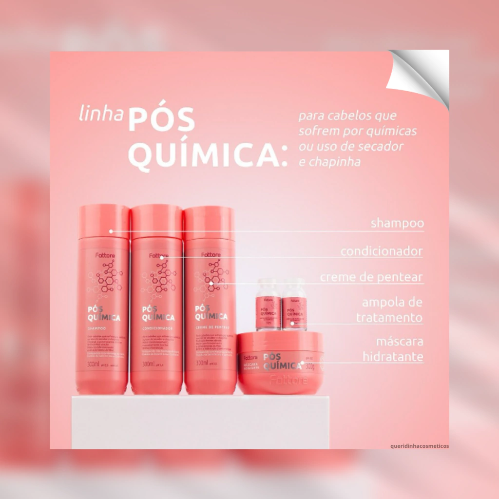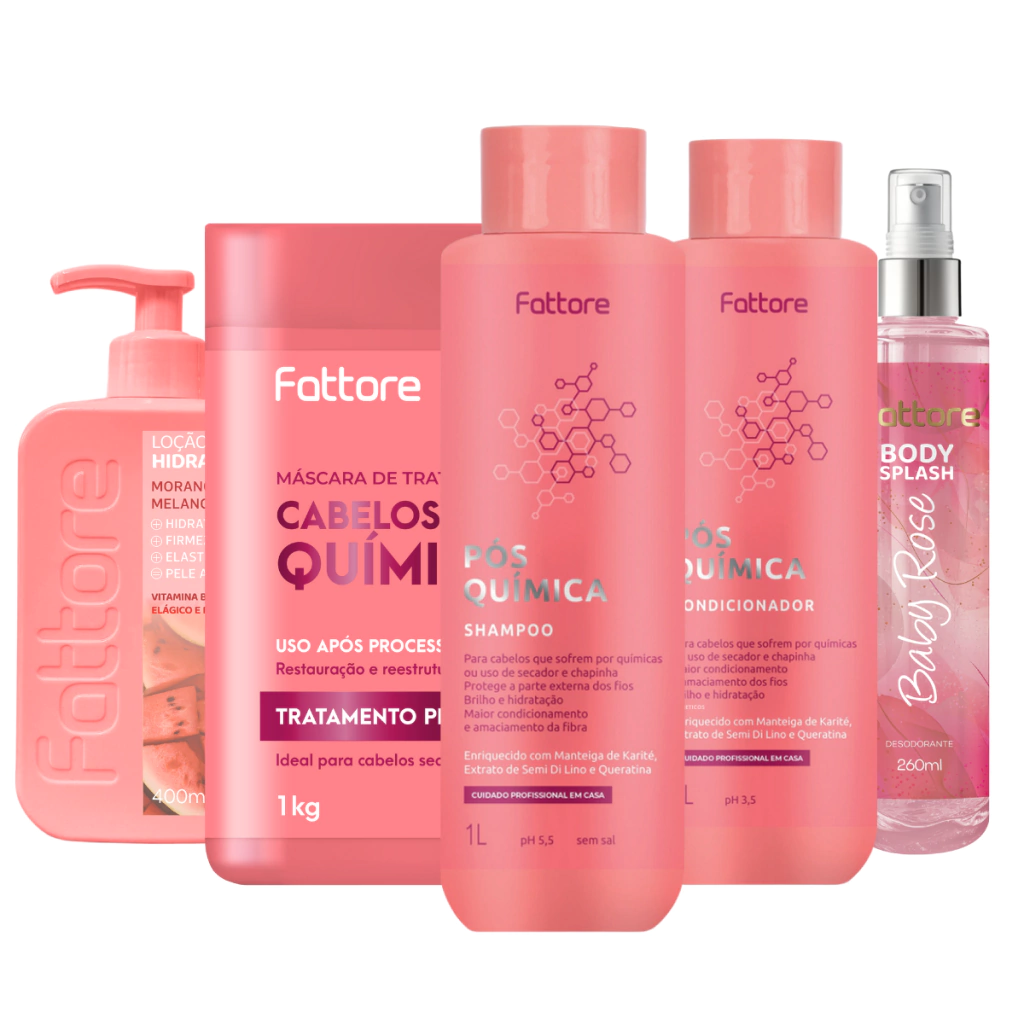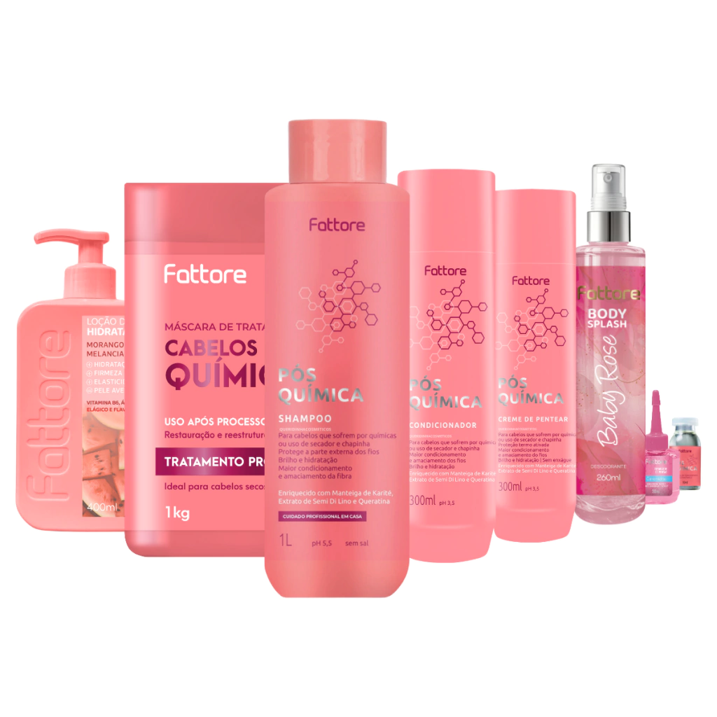 A linha Pós-Química Fattore foi especialmente desenvolvida para oferecer um tratamento completo e eficaz para cabelos danificados por processos químicos. Com fórmulas enriquecidas com Extrato Semi Di Lino e Queratina, esses produtos promovem brilho intenso, hidratação profunda e reconstrução dos fios, restaurando a saúde e a beleza natural dos cabelos.