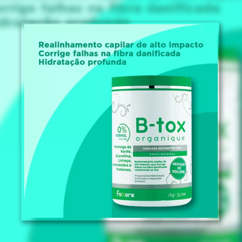 A Máscara Reconstrutora Fattore B-Tox Organique foi elaborada para proporcionar redução de volume e realinhamento corrigindo falhas na fibra capilar com um tratamento hidratante e proteico. Sua fórmula é rica em Manteiga de Karité, Queratina, Linhaça, Aminoácidos e Proteínas, que atuam para a garantir uma hidratação profunda e reposição.