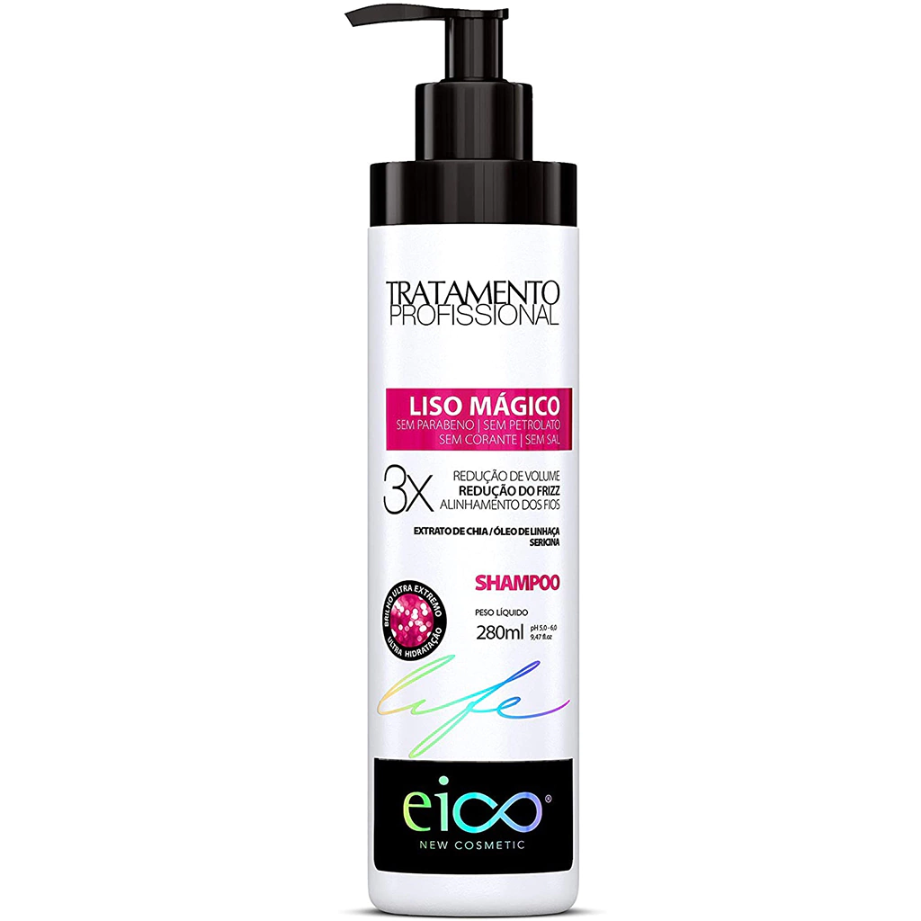 A Linha Eico Life Liso Mágico foi desenvolvida para cabelos alisados quimicamente ou naturalmente lisos. É uma linha multifuncional que poderá ser usada antes, durante ou após qualquer procedimento de alisamento ou escova. Irá reduzir gradativamente o volume e frizz dos cabelos alisados ou lisos, graças aos ativos extrato de chia, óleo de linhaça e sericina. Com a Linha Eico Life Liso Mágico, seus fios se manterão disciplinados, com brilho e com efeito liso duradouro.