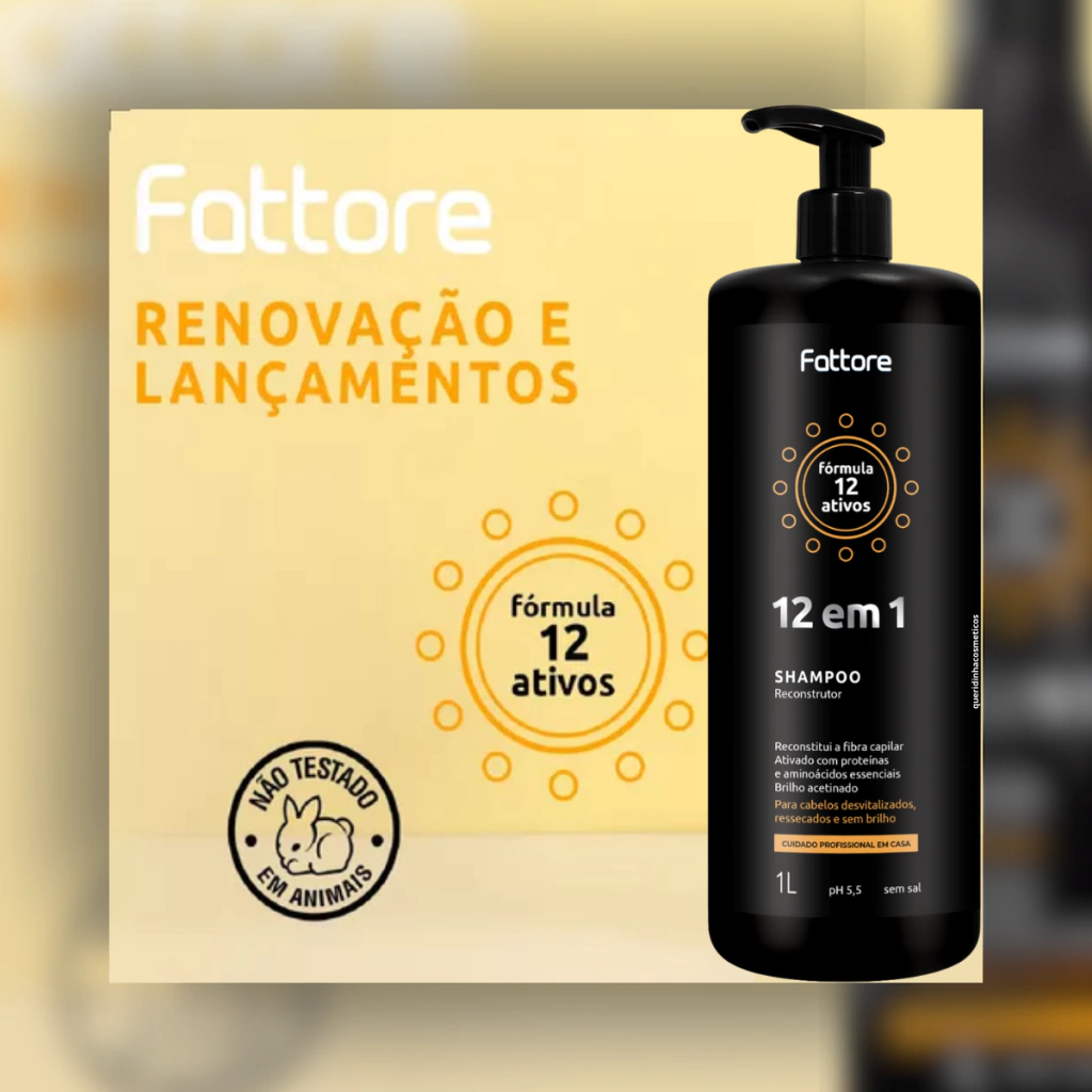 O Shampoo Reconstrutor Fattore 12 em 1 aliou em sua inovadora composição 12 ativos, otimizando assim o resultado de sua aplicação, proporcionando reposição de aminoácidos, brilho, fortalecimento do fio, sedosidade, condicionamento, eliminação das pontas duplas e dos fios porosos, reconstruindo a fibra capilar dos cabelos ressecados e quimicamente tratados, dando vida nova aos seus cabelos.